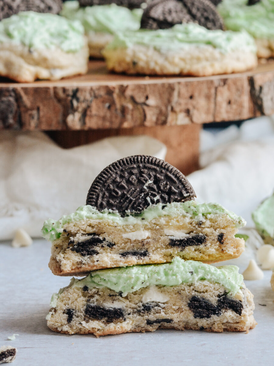 These Mint Oreo Cookies are a Crumbl Cookie copycat recipe. Chock full of white chocolate chips, oreo cookie bits and topped with a perfectly mint-y buttercream frosting.